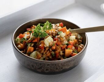 Gehaltvolle Urdinkel-Keimlinge in Kombination mit Karotten und rohem Gemüse bringen Pfiff, Genuss und Vitalstoffe auf den Teller. Ein farbenfroher Sommersalat.