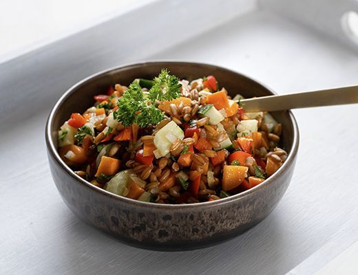 Gehaltvolle Urdinkel-Keimlinge in Kombination mit Karotten und rohem Gemüse bringen Pfiff, Genuss und Vitalstoffe auf den Teller. Ein farbenfroher Sommersalat.